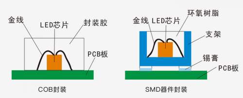 COB封装技术是指将LED发光芯片直接集成在PCB上,而非一颗一颗灯珠焊接于PCB板上。